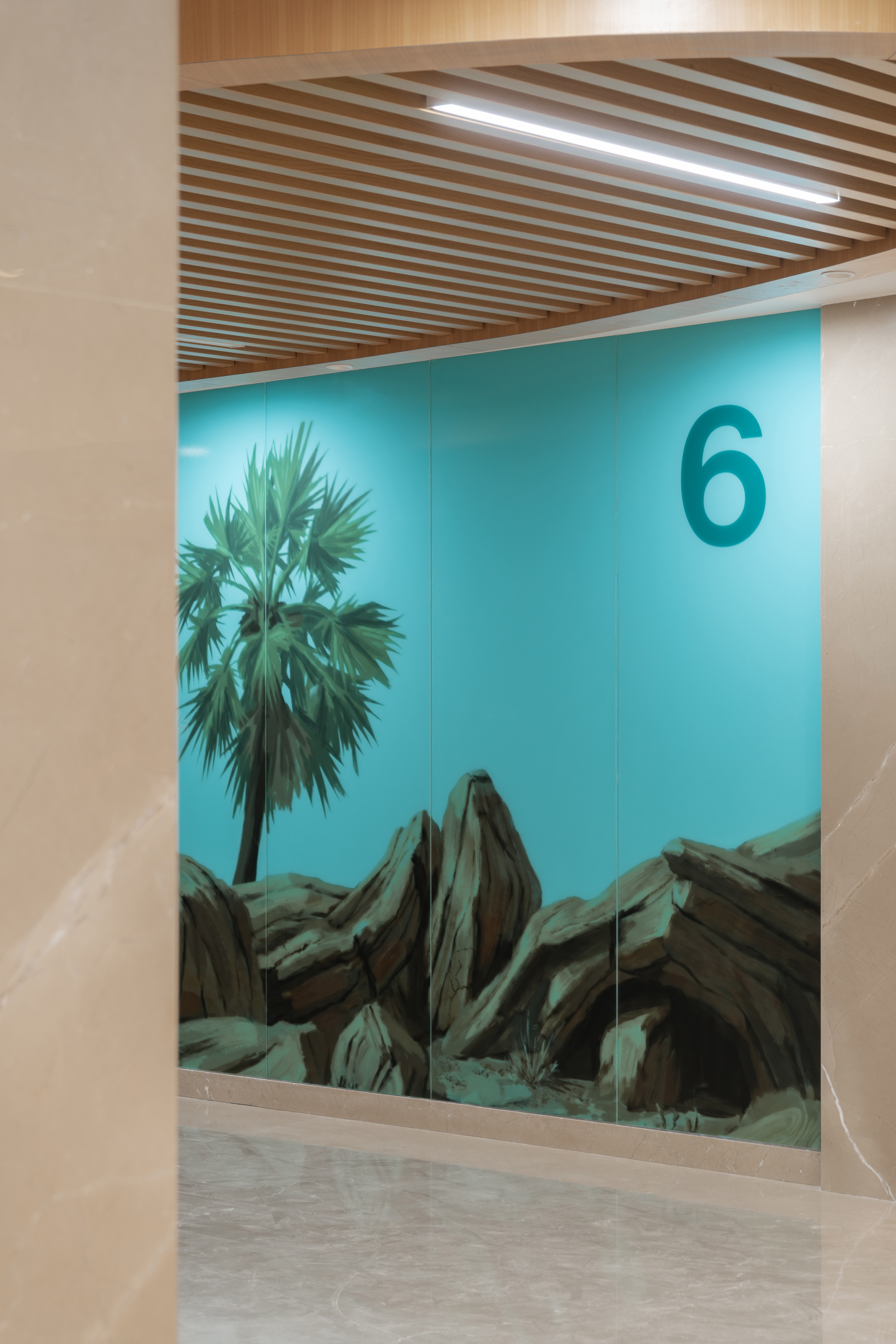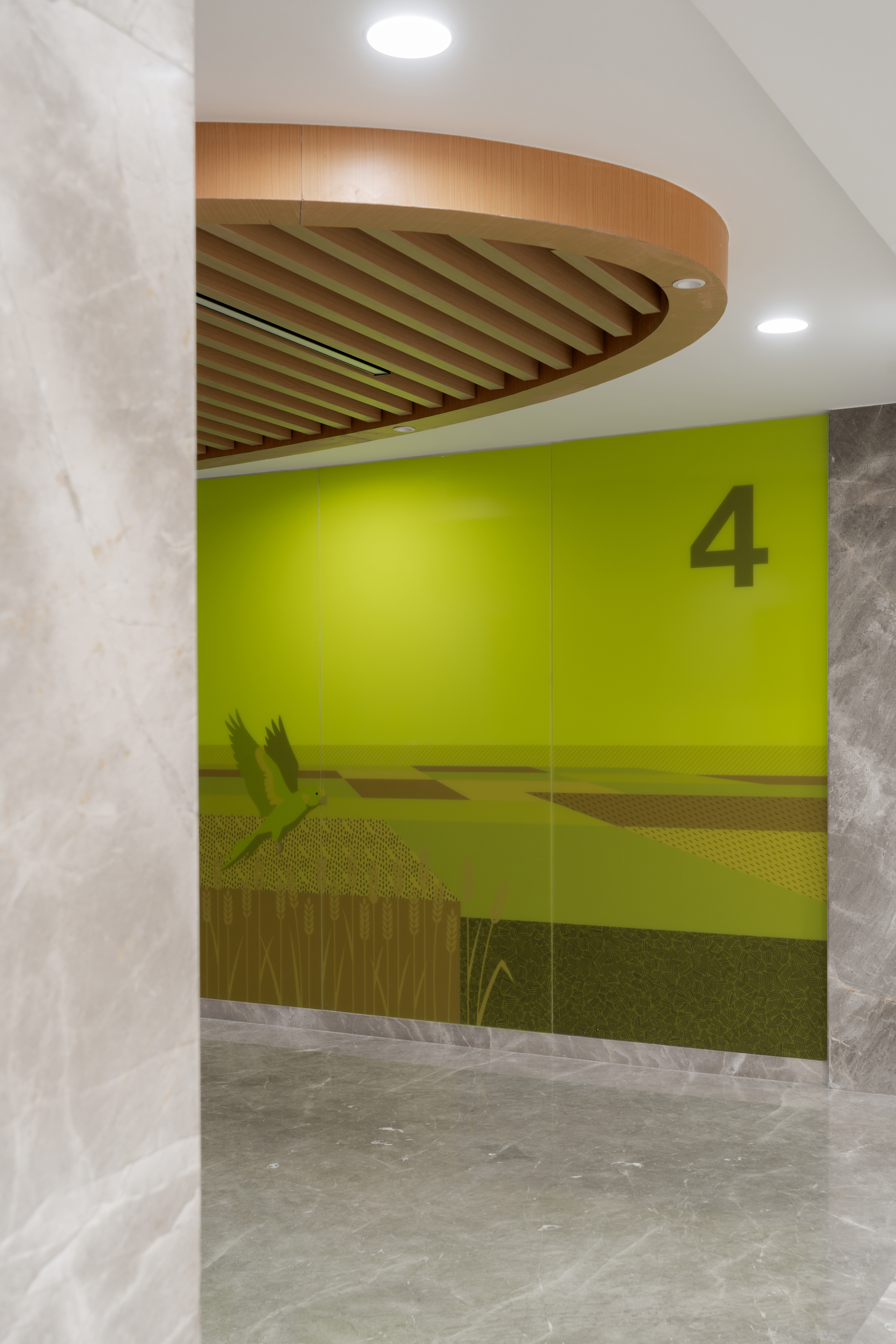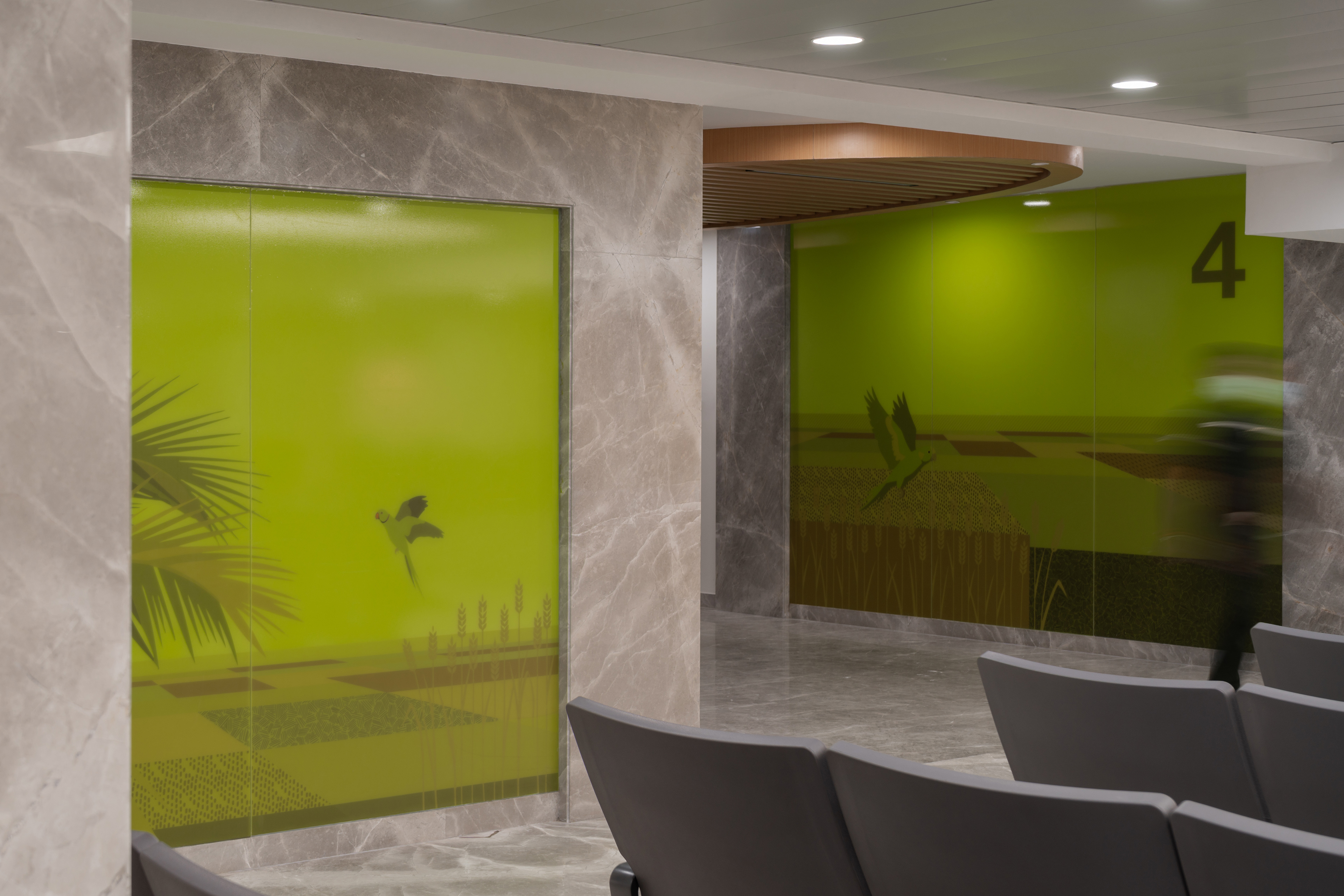 Each floor uses the hues of the lacquered glass in the interiors as the base colour to create a unique colour scheme for each department.