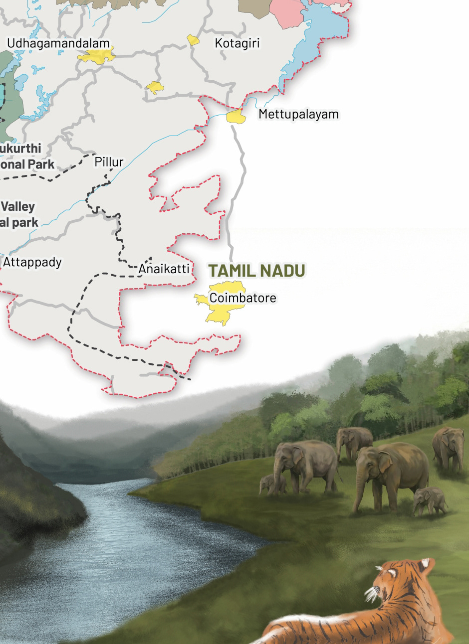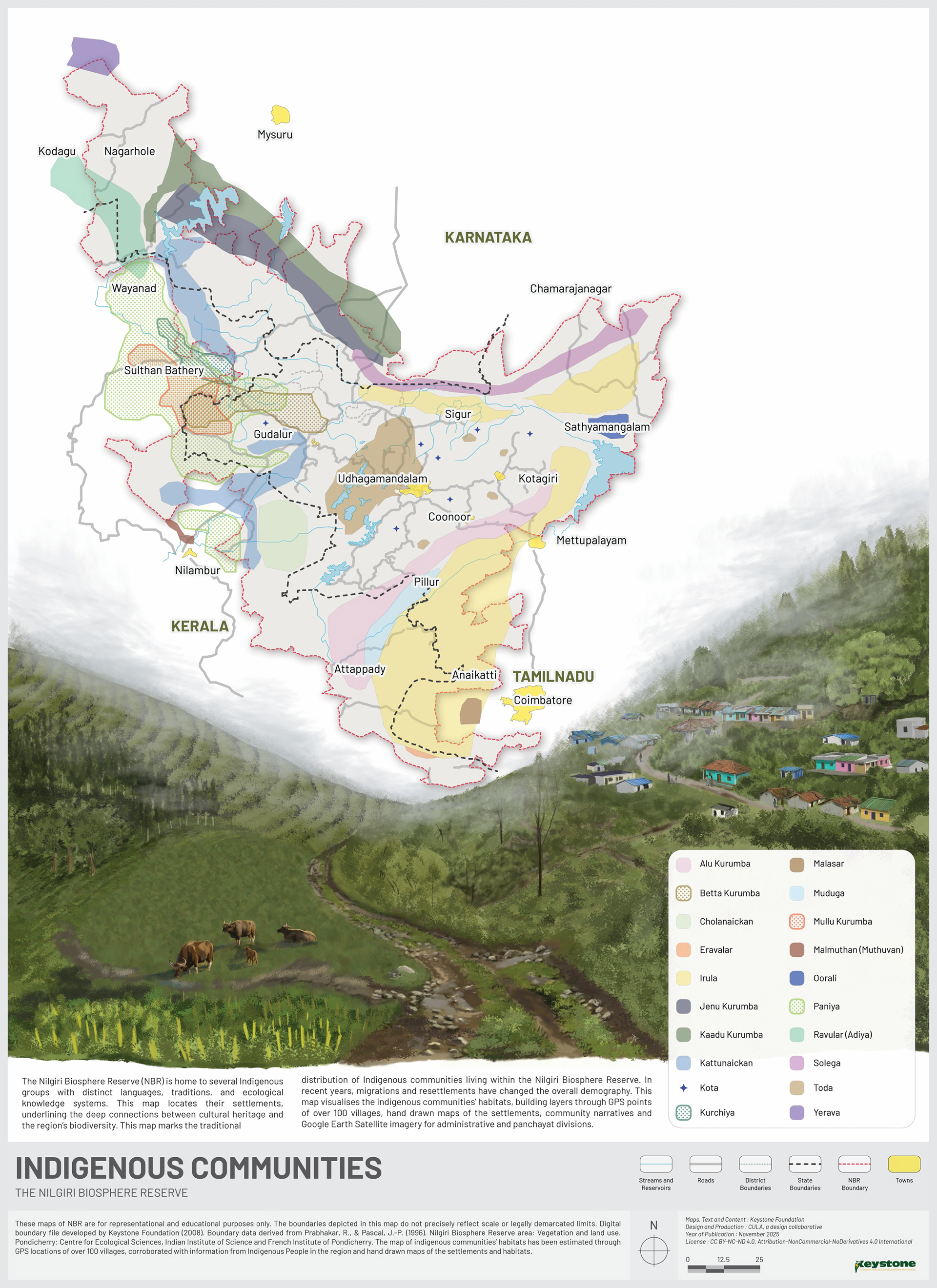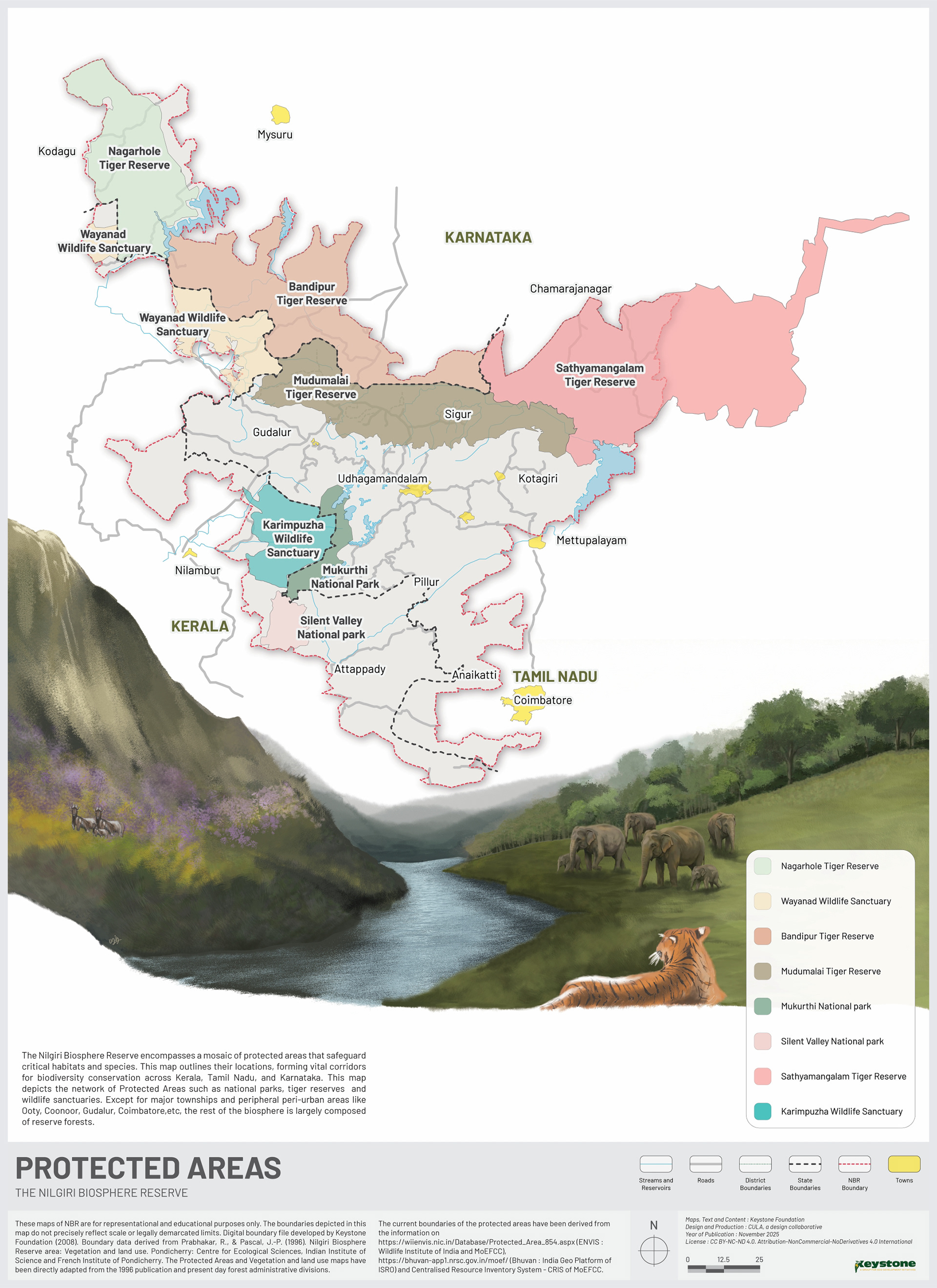 The following maps of the Nilgiri Biosphere Reserve were illustrated for Keystone Foundation to display in their meeting space at Kotagiri. Using the existing maps as reference, we redrew the maps, incorporating updated data and maintaining a design language that makes it easy to read the maps.