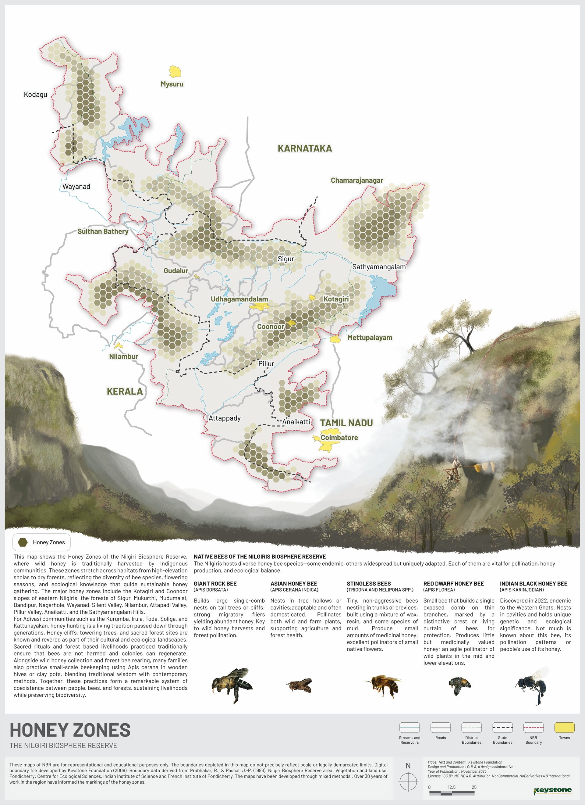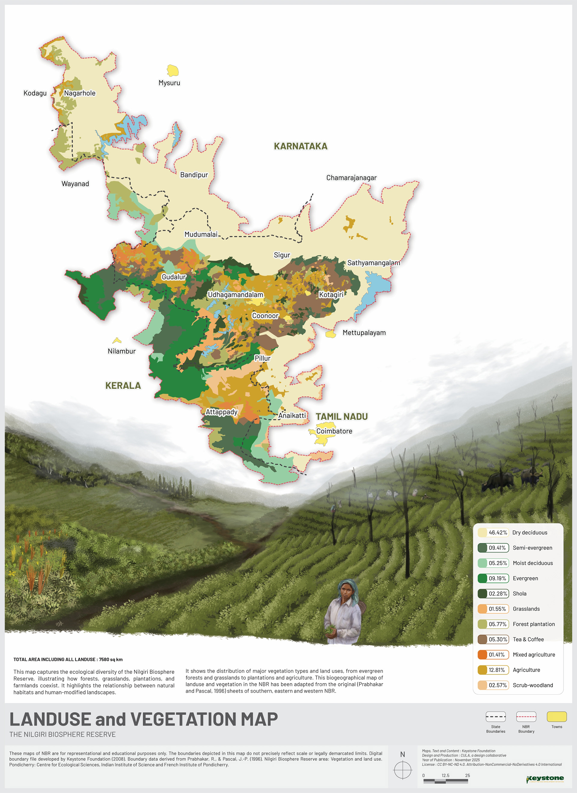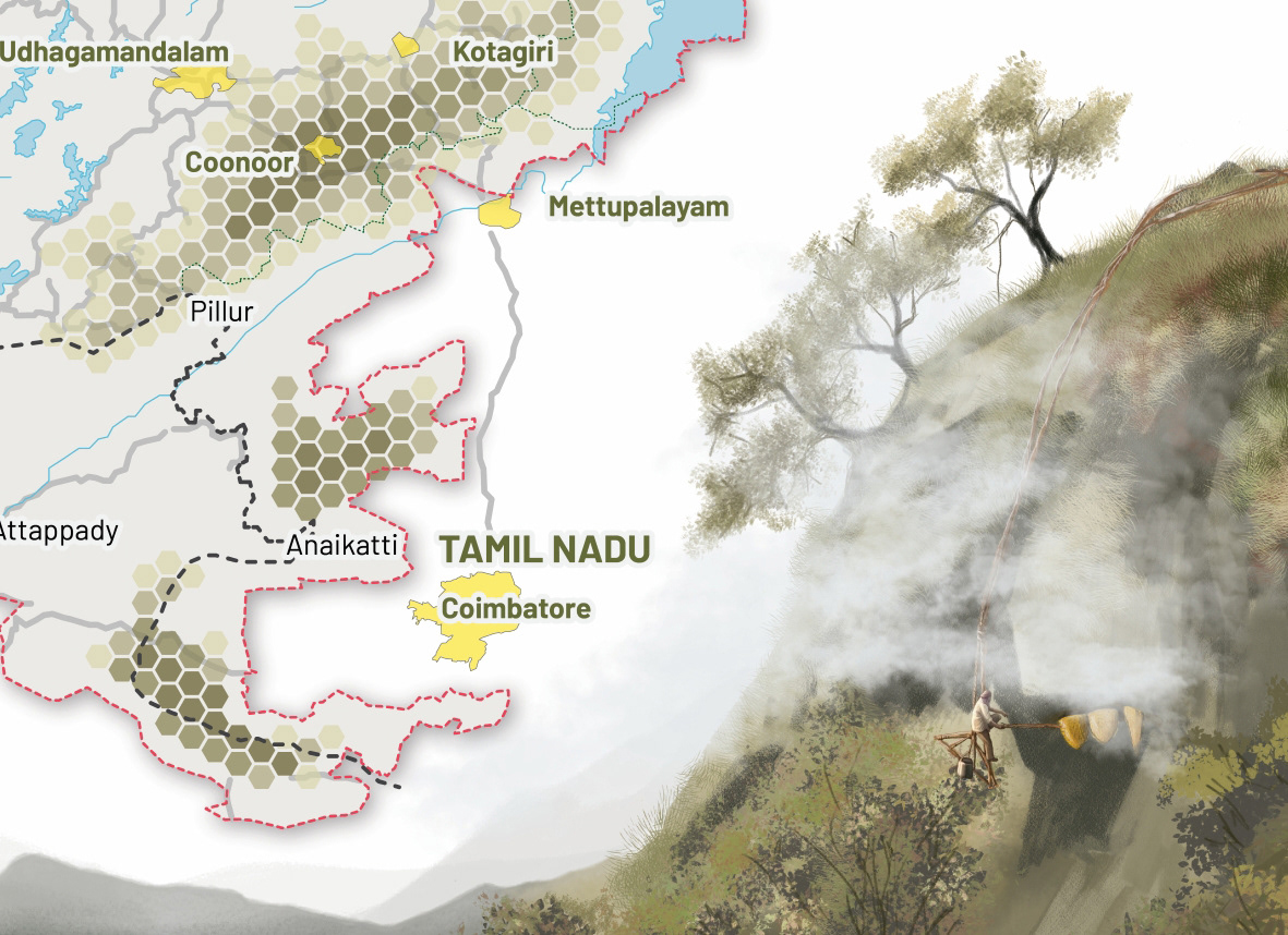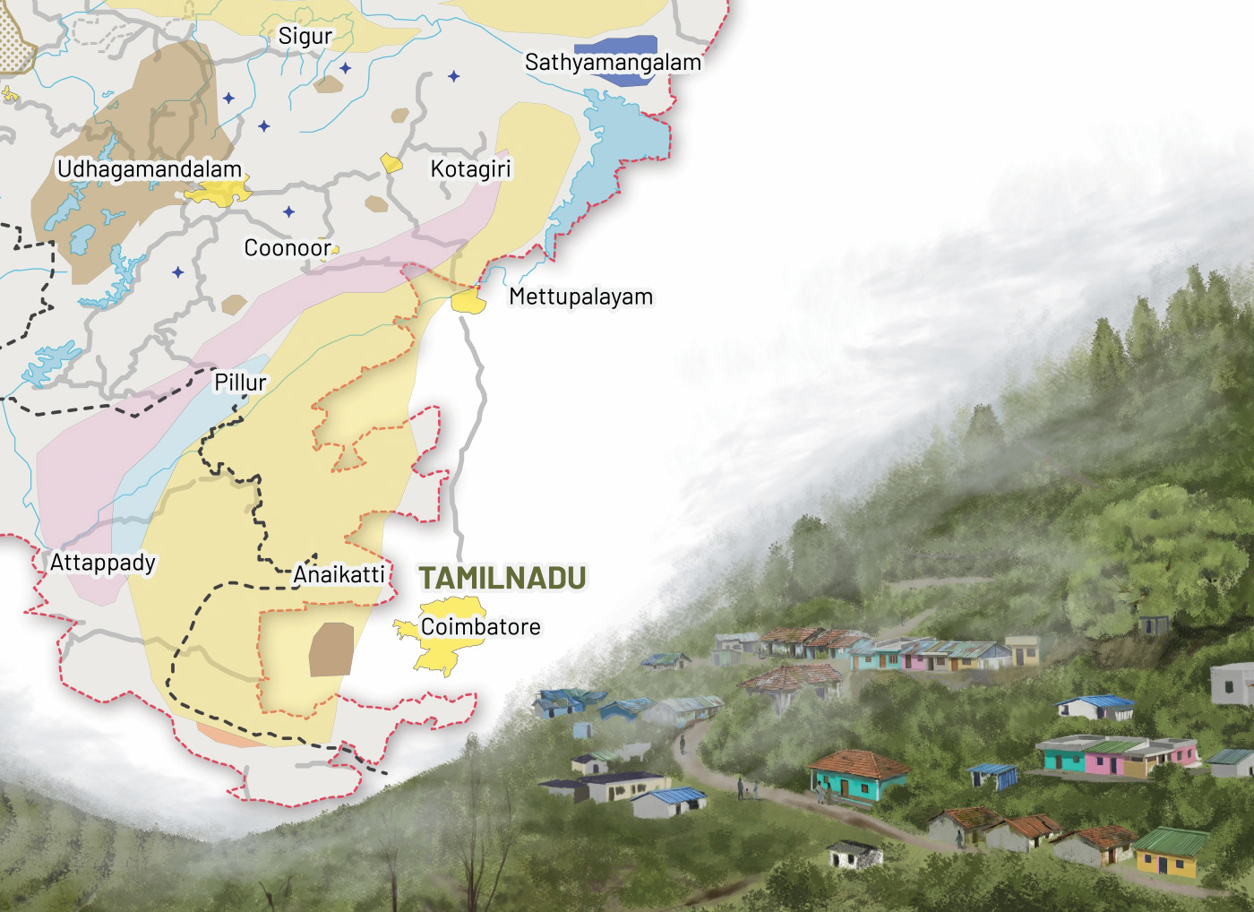 The following maps of the Nilgiri Biosphere Reserve were illustrated for Keystone Foundation to display in their meeting space at Kotagiri. Using the existing maps as reference, we redrew the maps, incorporating updated data and maintaining a design language that makes it easy to read the maps.